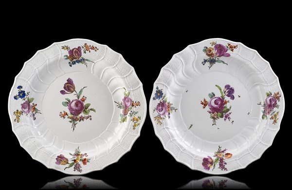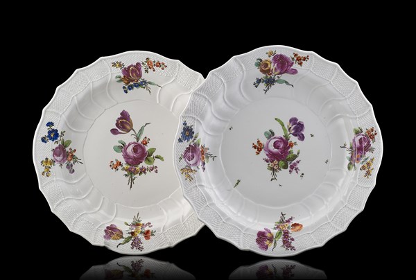 Manifattura di Vienna, fine secolo XVIII. Coppia di piatti in porcellana con bo