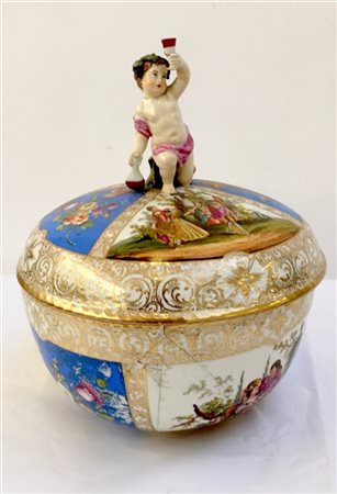 Manifattura tedesca, zuppiera in porcellana decorata in policromia e dorature a scene galanti e fiori. Presa a baccante a tutto tondo (gravi difetti e restauri)