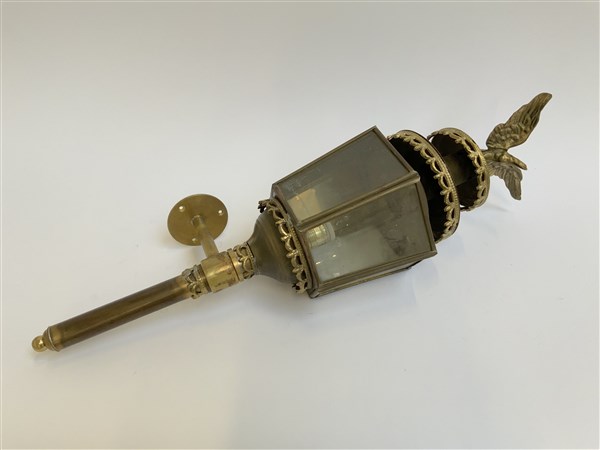 Lampada da muro in metallo e vetro a forma di lanterna sormontata da aquila dor