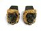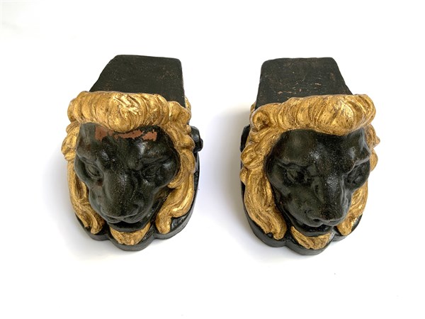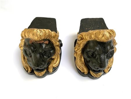 Coppia di basi in terracotta raffiguranti leoni decorati in policromia e doratura (difetti)