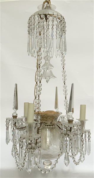 Lampdario a boccia a tre luci inciso a fiori. Decorato a pinnacoli e perlinature in vetro, 1920 circa (h cm 80 ca) (difetti e mancanze)