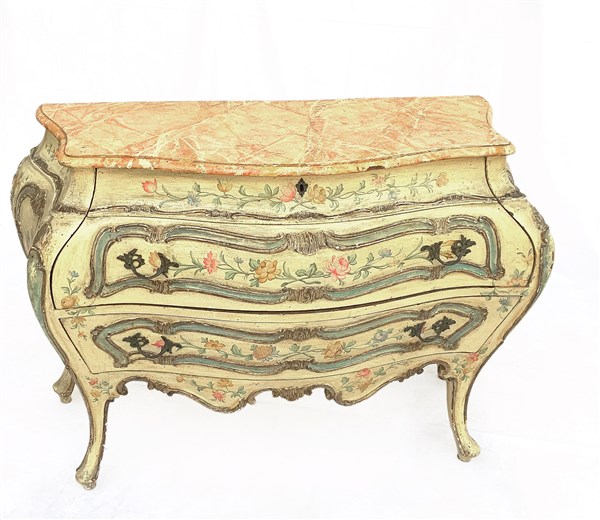 Antico comò di forma bombata a tre cassetti in legno laccato e dorato, piano in legno a finto marmo (cm 130x85x53) (difetti)