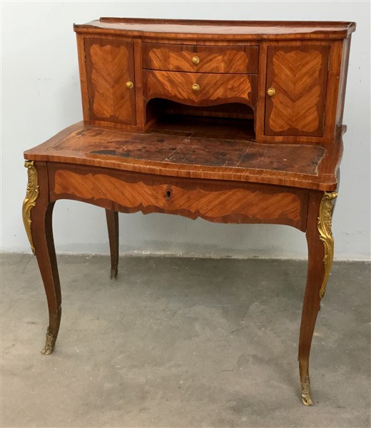 Scrittoio con alzata lastronato in bois de rose e bois violet, cassetto sottopiano e alzata con due antine, due cassettini e vano centrale. gambe mosse decorate con guarnizioni in bronzo dorato (cm 90x406x56) (difetti e mancanze)