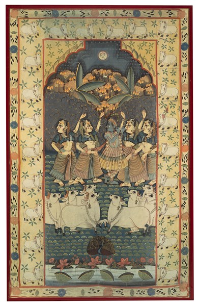 A painting depicting a deity and dancing female attendants, bordered by animals and decorative motifs against a beige ground, colours on cloth, mounted and framed. India, early 20th century (192x123 cm) (minor flaws)