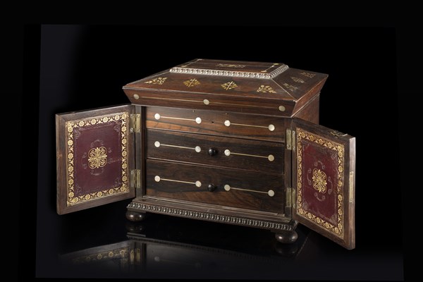 Portagioie in palissandro intarsiato in madreperla a motivi floreali. Fronte a due sportelli celanti cassetti. Coperchio a urna sollevabile (cm 30x26x23) Fine secolo XIX (difetti e mancanze)