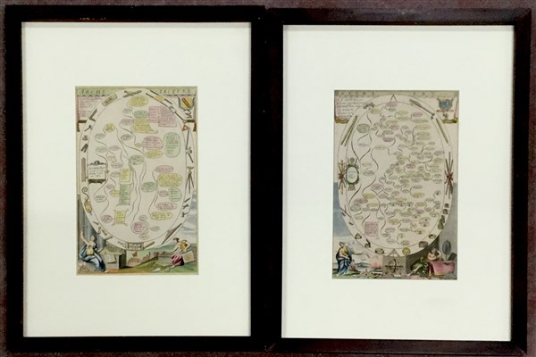 Coppia di incisioni allegoriche colorate inerenti l'architettura e la geometria