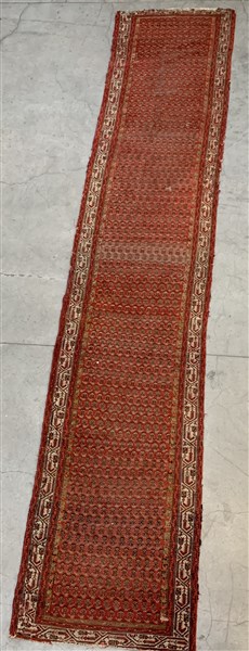 Tappeto Serabend, Persia, secolo XX, decoro Mir con file di Boteh su fondo rosso (cm 495x93) (Difetti, rapature e mancanze)