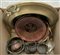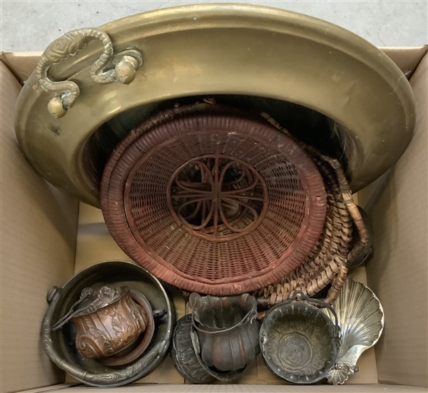 Cartone contenete una fioriera e numerosi piccoli secchielli in rame ed altri materiali (difetti)