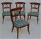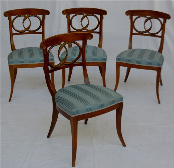 Gruppo di quattro sedie con gambe mosse, schienali a giorno con cartelle decorate da cerchi intagliate e dorate ad animali fantastici , sedute rivestite in tessuto azzurro. Secolo XIX (difetti)