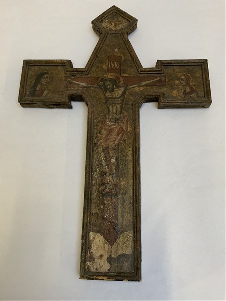 Antico crocifisso in legno dipinto in policromia (cm 42x62) (difetti)