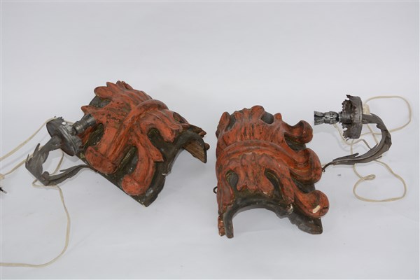 Coppia di applique ad una luce in legno e metallo decorate a motivi fogliati in legno intagliato e laccato (cm 28x37x23) (gravi difetti)