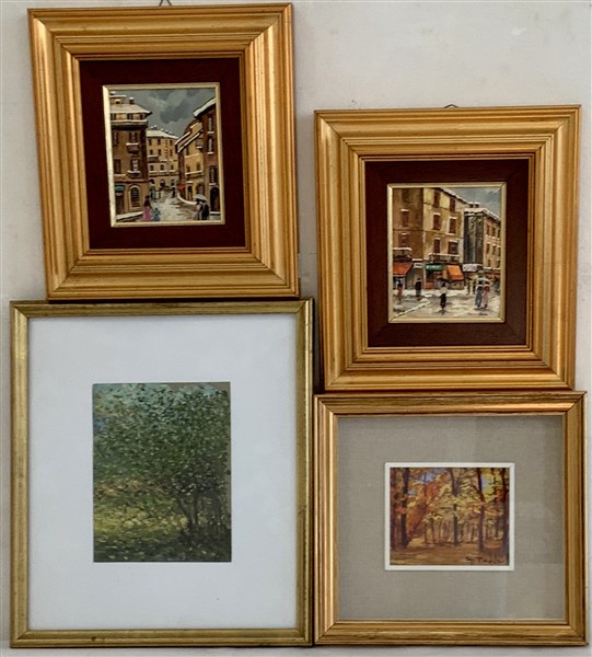 Autori vari. Lotto composto da quattro piccoli dipinti ad olio raffiguranti paesaggi boschivi e scorci di città. Misure diverse, in cornici