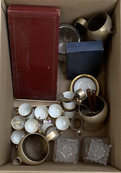 Cartone contente oggetti per la tavola fra cui tre postate per bambino e due a servire in argento e lamina d'argento, in custodie. (difetti)