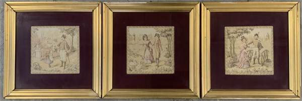 Lotto di tre arazzetti raffiguranti scene galanti napoleoniche in paesaggi con architetture. Italia inizio sec. XX (cm 15x15) in cornici (difetti)