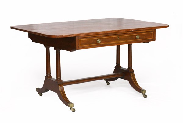 Tavolo scrittoio in noce filettato in legno chiaro,a due cassetti nella fascia, gambe a colonne binate poggianti su basi sagomate riunite da taversa, piedi muniti di rotelle. Inghilterra inizio secolo XX (cm 138x75x100) (difetti)
