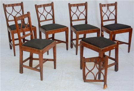 Gruppo di sei sedie in legno, con gambe anteriori rastremate, schienali a giorno intagliati con cartella a doppia X. Secolo XVIII (difetti e restauri)