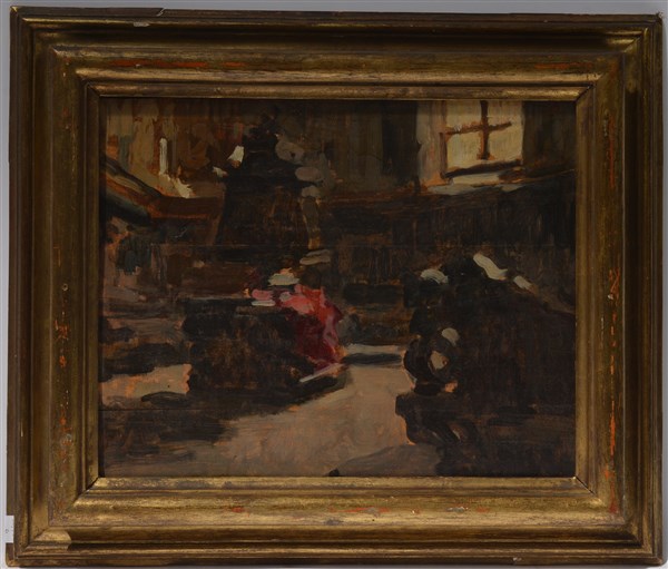 Achille Cattaneo (Attribuito) "La sacrestia" olio su compensato (cm 32x40) In co