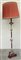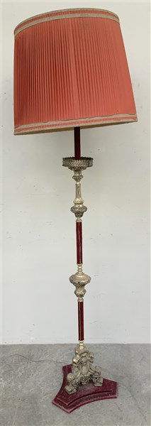 Piantana a tre luci in metallo argentato con fusto e base rivestiti in velluto bordeaux, ricavata da un antico porta cero (h cm 175) (difetti)
