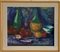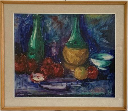 Firma indecifrata "Natura morta con fiasco" olio su comepnsato (cm 50x60) firmato e datato 1961 in baso a destra, in cornice (lievi difetti)
