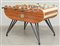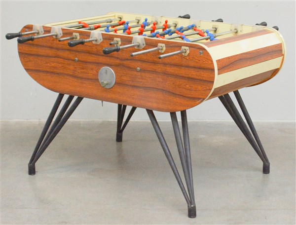 Calcio Balilla con rivestimento in formica di differenti colori, piano in vetro retroverniciato e piedi in ferro verniciato. 1970. Funzionante con le 50 lire. (cm 132x87x76) (difetti)