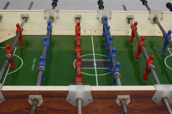 Calcio Balilla con rivestimento in formica di differenti colori, piano in vetro