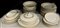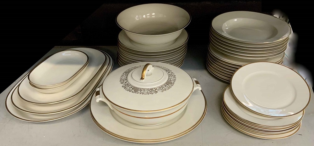 Parte di servizio da tavola in ceramica bianca con bordo dorato composto da diciotto piatti piani, sei piatti fondi, sei piattini da frutta, una zuppiera, un'insalatiera e sette piatti da portata. Germania, secolo XX. Marcato sotto la base con il simbolo della manifattura. (difetti)