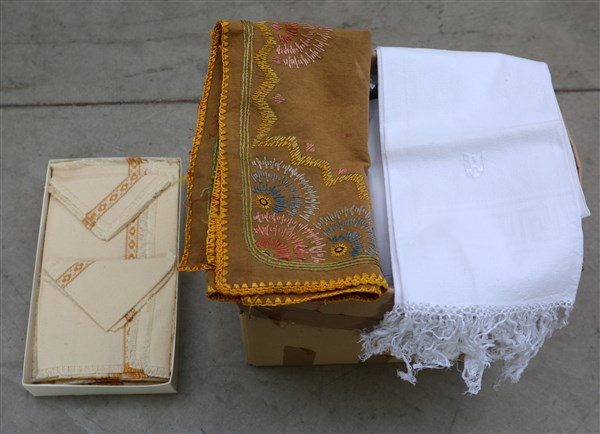 Lotto di numerosi tessuti di varie fogge e dimensioni. Alcuni decorati con ricami, alcuni con passamanerie e pizzi. (difetti)