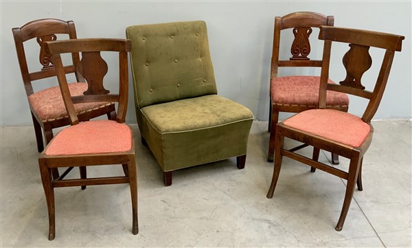 Lotto di due coppie di sedie con schienali a giorno unite a una poltrona rivestita in tessuto verde (difetti)