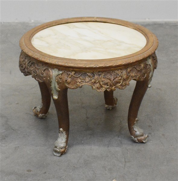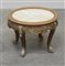 Tavolino tondo a quattro gambe mosse in legno intagliato e dipinto con piano in marmo. (h cm 43; d cm 58) (difetti)