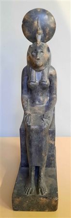 Riproduzione in gesso patinato di divinità egizia. stampiglio museo del Louvre al retro. (h cm 60) (difetti)