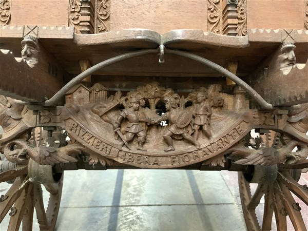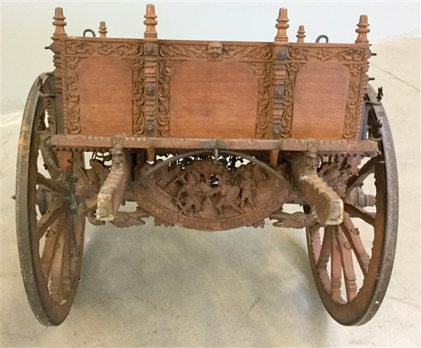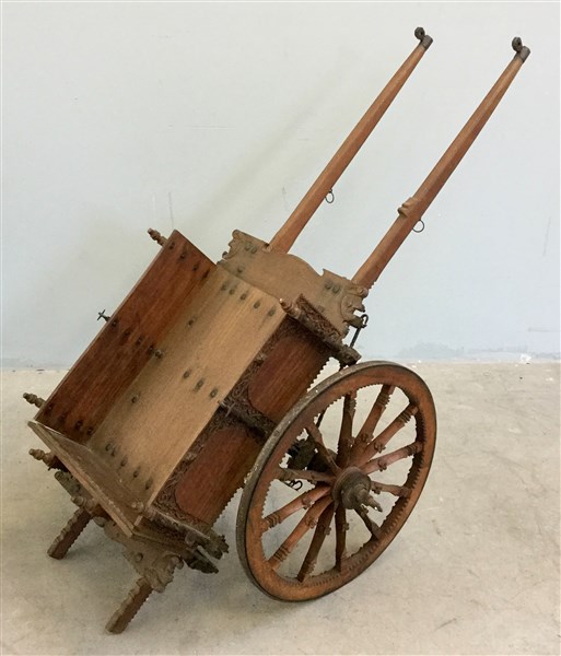 Piccolo carretto siciliano in legno intagliato e ferro, decorato a motivi floreali e mascheroni, iscritto Rizzieri Libera Fioravante. Fine secolo XIX, inizio XX (cm 48x48x110) (difetti)