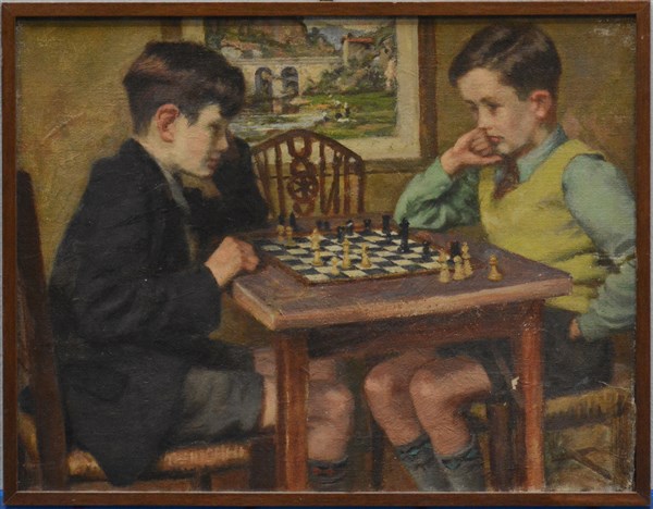Charles H.H. Burleigh 1875- 1956 (Attribuito) "The game of chess" olio su tela