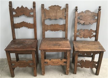 Tre antiche sedie in noce in stile rinascimentale con cartelle intagliate e sagomate (difetti)