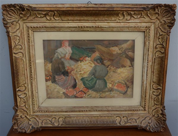 "La raccolta delle pannocchie" olio su compensato (cm 23x34) Firmato in alto a destra. Al retro: titolato. In cornice
