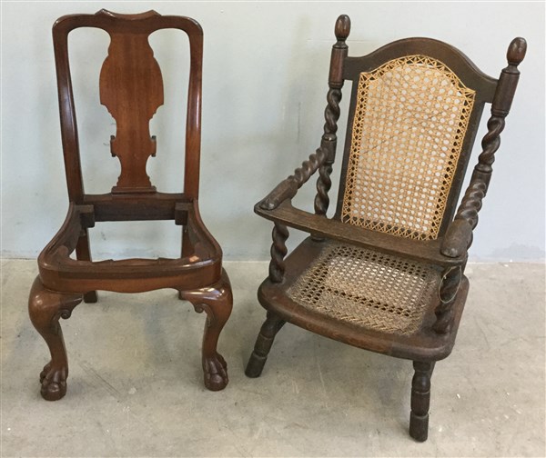 Lotto di due sedie per bambini di cui una con seduta e schienale incannucciati e una in mogano (difetti e mancanze)