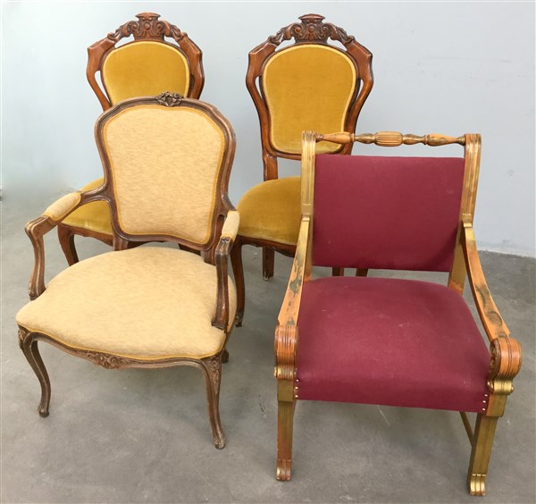 Lotto composto da una coppia di sedie e due poltroncine di fatture differenti (difetti)