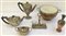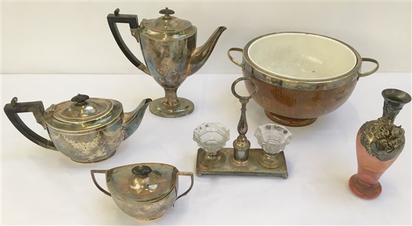 Lotto composto da un servizio in metallo argentato composto da teiera, caffettiera e lattiera unito a tre oggetti diversi (difetti)