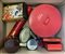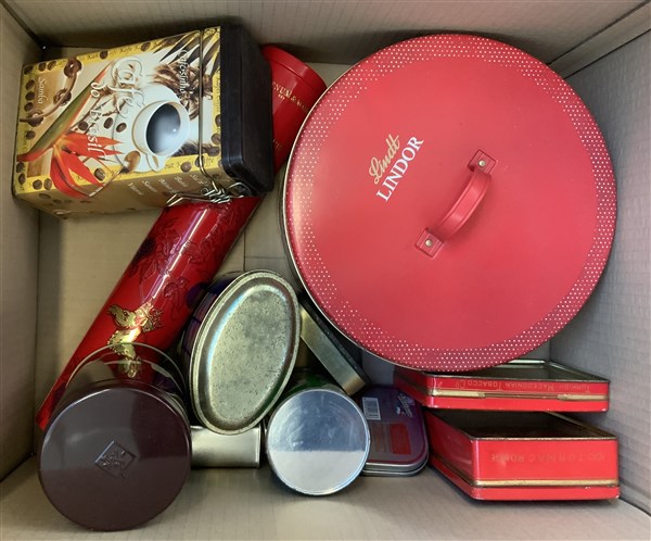 Cartone contenente scatole in latta serigrafata di epoche differenti (difetti)