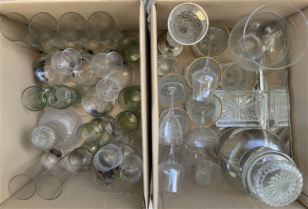 Lotto di due cartoni contenenti bicchieri ed oggetti per la tavola in vetro (di