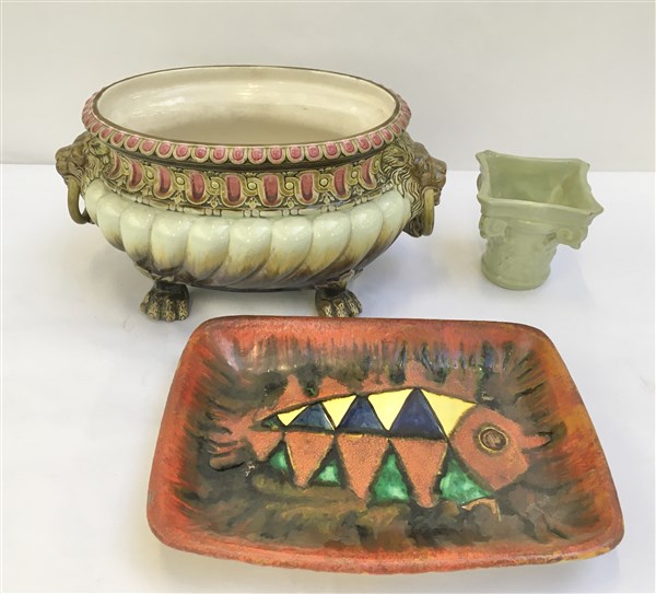 Lotto composto da un piatto firmato De Simone, un centrotavola liberty ed un vasetto a capitello siglato MF (difetti)