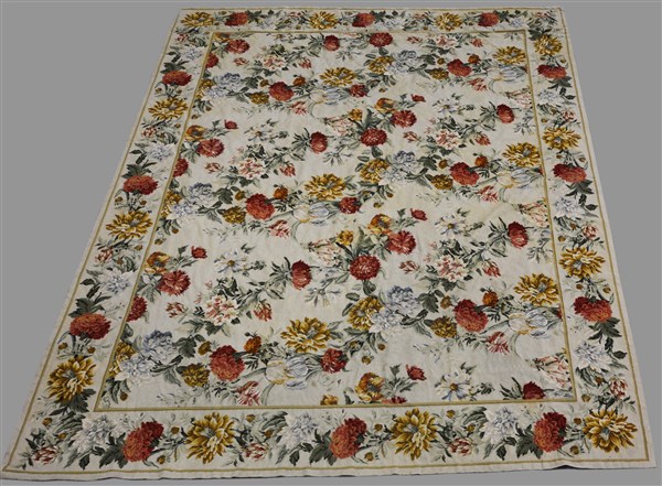 Tappeto piccolo punto di moderna manifattura. Decoro floreale policromo su fondo beige. (cm 295x233) (difetti)