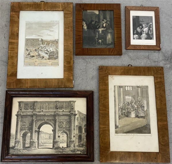 Lotto composto da cinque incisioni di diversa epoca e decori. In cornici (difetti)