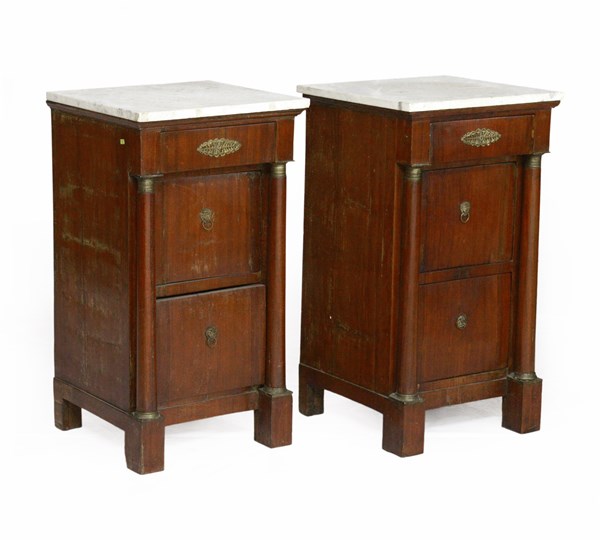 Coppia di comodini lastronati in noce ad un cassetto sottopiano, uno sportello ed un cassetto sul fronte. Montanti e colonna torniti con base e capitello in metallo dorato, piedi a pilastro, piani in marmo bianco. Secolo XIX (cm 44x80x42) (difetti)