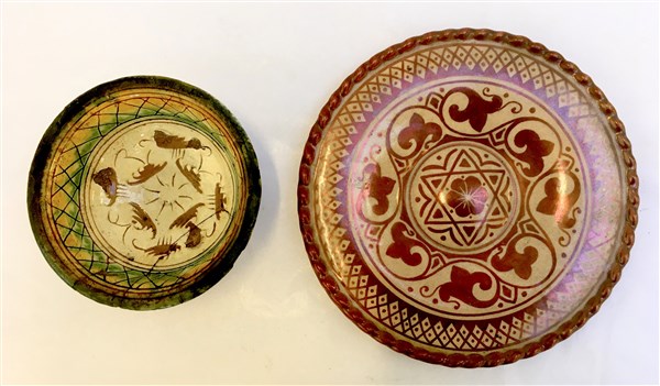 Arte orientale, ciotola e piatto in ceramica decorato a lustro. Epoche diverse