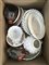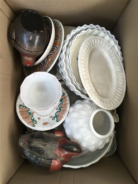 Cartone contenente numerosi oggetti in porcellana e ceramica di diverso decoro ed epoca (difetti)