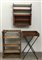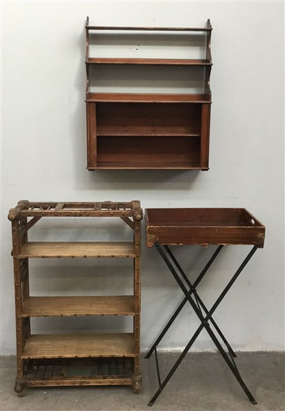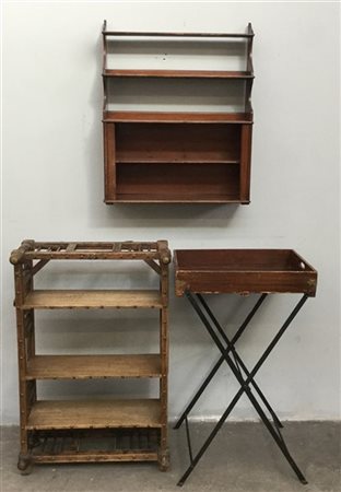 Lotto composto da un mobiletto pensile, un vassoio in legno con trespolo in ferro e una libreria a giorno realizzata con materiale di recupero (difetti e mancanze)