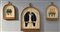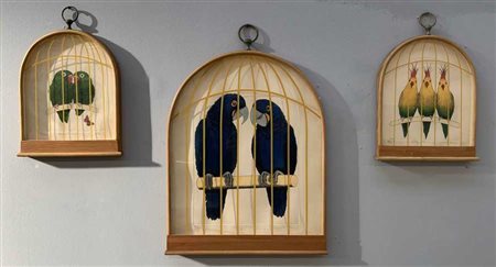 Firma indecifrata, lotto di tre incisioni colorate raffiguranti pappagalli con vetri e cornici sagomate simulanti gabbie. Firmate e numerate in basso (cm tot 44x56 e 28x34) (difetti)