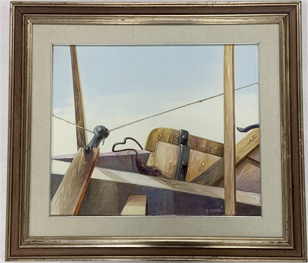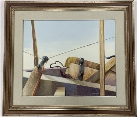 "Oggetti e luce" olio su tela (cm 50x60) Firmato e datato 1977 in basso a destra. Al retro: titolato, firmato e datato. In cornice