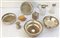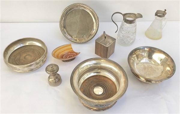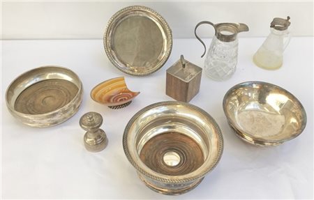 Lotto composto da due sottobottiglie, una ciotola e sei oggetti diversi in argento e metallo (difetti e mancanze)