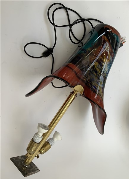Lampada da tavolo a tre luci con fusto in ottone e diffusore ricavato da un vaso (h cm 64) (lievi difetti)